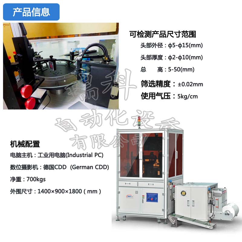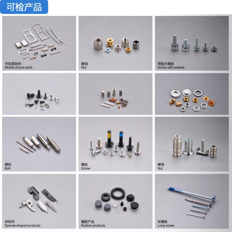 • 本系统检测功能包括多段高度、多度宽度,断针、塞孔,无效牙长(颈下牙高),牙底径,牙外径,牙距,斜牙、搓牙不良,螺丝长度,头部有无电镀,有无倒角,塞孔,偏心,有无牙。