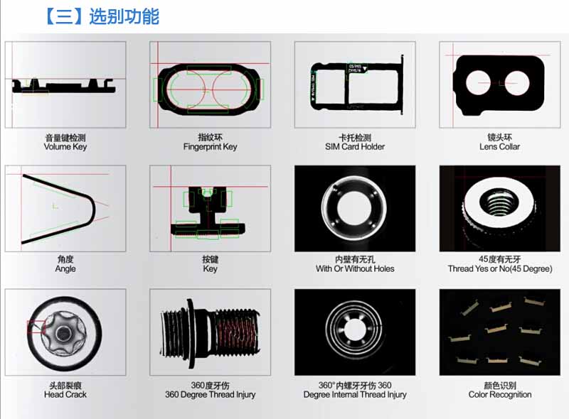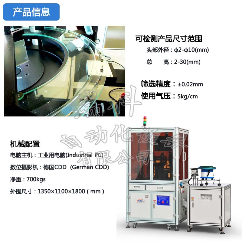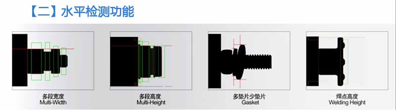 • 本系统检测功能包括多段高度、多度宽度,断针、塞孔,无效牙长(颈下牙高),牙底径,牙外径,牙距,斜牙、搓牙不良,螺丝长度,头部有无电镀,有无倒角,塞孔,偏心,有无牙。