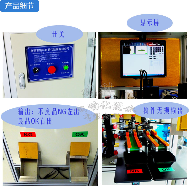 硬体配备包含振动送料机、下料轨道、检验平台、计算机系统為一安全、便利,且节省人力成本的自动化设备。分别介绍如下: