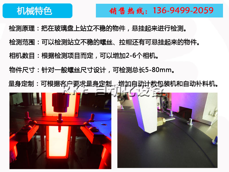 分度盘筛选设备检测螺柱,把在玻璃盘上站立不稳的物件,悬挂起来进行检测。检测范围广,速度快,精度高